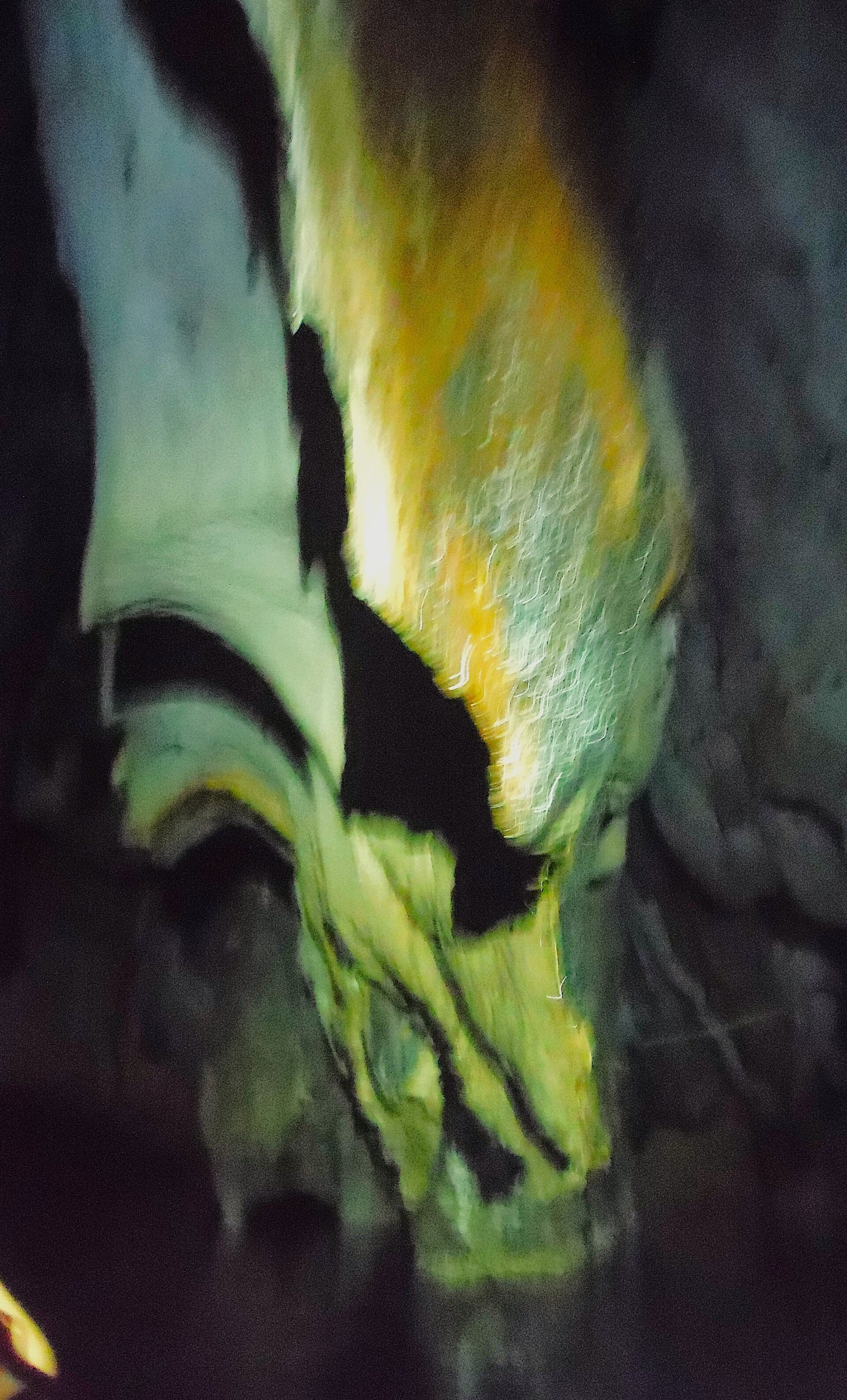 The major attraction for this stop was a two-hour drive to Puerto Princesa Subterranean River National Park (Underground River). This is a UNESCO World Heritage Site and one of the New 7 Wonders of Nature. The underground river runs for about 8 km beneath limestone karst mountains before flowing into the sea. In order to get to the mouth of cave/river, we took a local water taxi to a beach and then a walk to catch a boat tour into the cave to see stunning rock formations, cathedral-like chambers, and a variety of bats and swifts. From top to bottom, left to right - Water taxi and landing beach to start the tour, monitor lizard welcoming us, Kathie donning her protective headgear, here we're getting ready to board our tour boat at the mouth of the river/cave. We were warned multiple times not to look up with our mouth open because a bat, and there were hundreds of them, might decide to let loose with a secretion. Once inside the river/cave, its bitch black, with the only illumination coming from our boat driver's headlamp. Trying to take pictures where he was pointing his headlamp was an exercise in futility, but I'll show you a few just to get an idea of what we were seeing on this 45-minute tour.