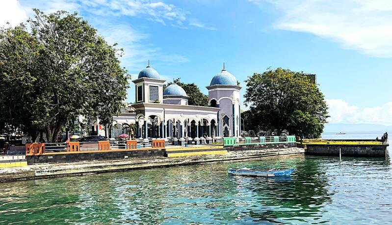 Our primary destination for this stop was the port of Manado, on the western side of the island. We took a two-hour taxi ride ($18) across the island to stay at a nice new hotel (Swiss Belhotel - $39 a night). In the rain that evening, we took a walking tour through Manado's Chinatown district and then stopped for a typical Indonesian dinner ($4 for both of us with drinks). Here's a few Chinese temples and dinner.